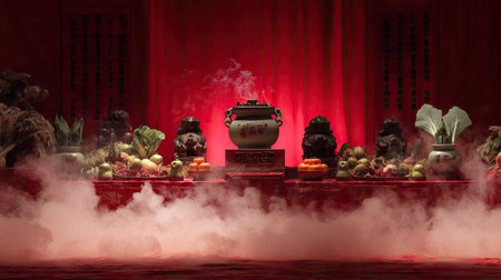 A captivating scene featuring a traditional altar adorned with various offerings amid incense smoke, set against a vivid red background, celebrating cultural rituals.