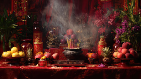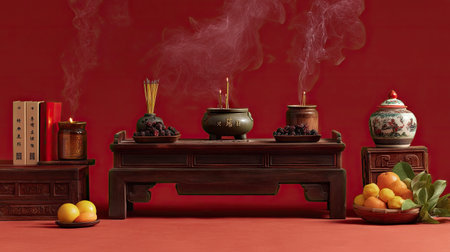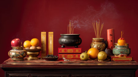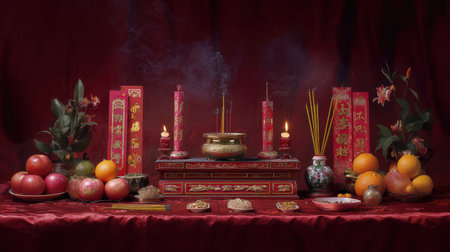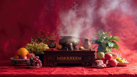 An exquisite composition showcasing a traditional Asian altar adorned with incense, fruits, and decorative items. The rich red background enhances the spiritual ambiance.