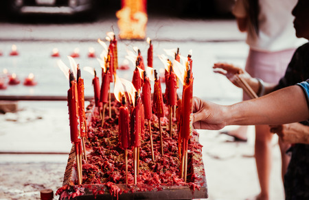 Burning red chinese candle at Wat Mangkon Kamalawat famous Chinese temple in Bangkok, Wat Mangkon Kamalawat (Leng Noei Yi). close up shot