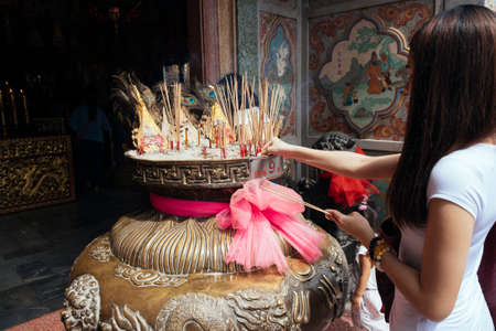 Chinese people pray with incense sticks in the traditional Chinese temple.