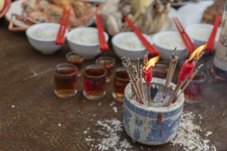 People with paper money ,paper gold and burn joss stick at Chinese shrine for making merit and pay respect to god in Chinese New Year day may life be blessed with health and happiness all through.