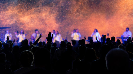 silhouette of people worshipping in front of stage with copy space and selective focus