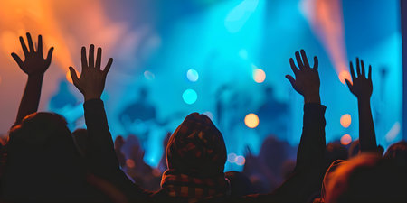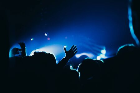 Silhouettes of man's hands raised up over crowd of people, enjoying rock concert, bright blue lights, celebrating new year, active night life concept