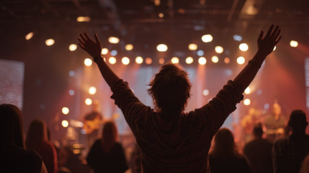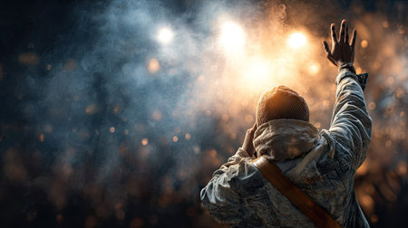 A silhouetted individual stands with raised hands in front of a warm light, amidst an unseen crowd, evoking emotions of celebration and connection.