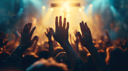 Capturing divine moments: church worship concept Christians, raised hands, earnestly pray and worship to cross in the sacred ambiance of a church building, expressing faith and spiritual connection
