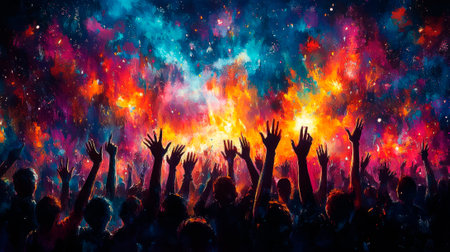 In a lively night scene, hands reach towards colorful beams of light cutting through the dark sky. Festival-goers bask in the electric atmosphere, enjoying the energy of the music and lights.