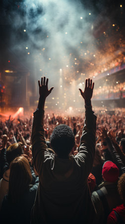 The crowd at a concert in front of the stage with hands raised up, Peoples closeup rear view raising their hands, AI Generated