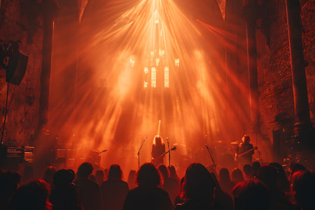 Silhouettes of a crowd at a concert with a band on stage, dramatic lighting with smoke and beams of light.
