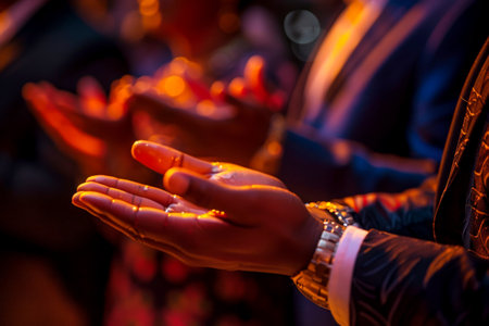 Praying man's hands illuminated by sunlight in focus. Muslim man praying. Ramadan and oil lamp background photo. Islamic background photo. Religious muslim man raising hands.