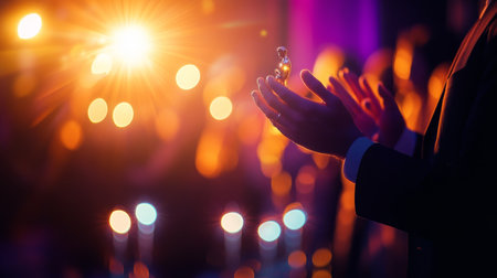 Audience Gives Standing Ovation Against Illuminated Background at Awards Gala Ceremony Event