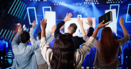 Back view of Christians worship with raised hands in church. Defocused, suitable for background.