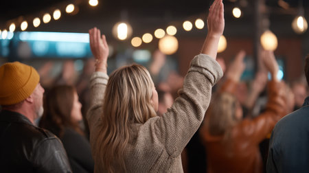 A woman with raised hands expresses joy and spirituality amidst a lively crowd, capturing an inspiring moment of celebration and connection.