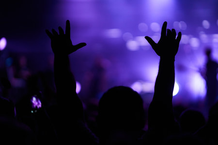 Excited Crowd with Raised Hands Enjoying a Memorable Live Music Performance Under Bright Stage Lights