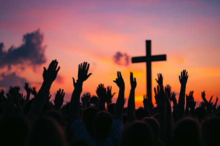 Silhouetted crowd with raised hands in worship at sunset near a cross during a service