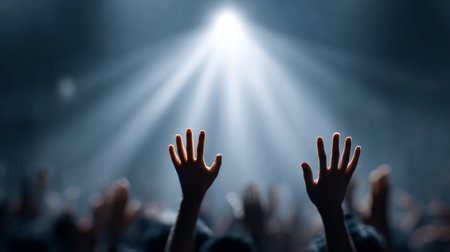 Raised hands reaching toward bright stage light, symbolizing collective hope and solidarity during intense political or religious gathering, capturing emotional unity