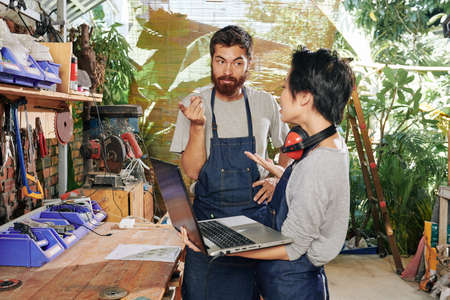 Team of carpenters in denim aprons holding laptop and discussing new project