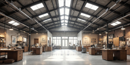 Empty industrial style office space with workstations, computers, shelves and large windows