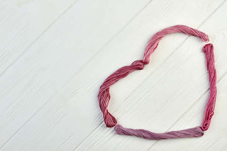 Heart from threads and copy space. Textile threads arranged in a shape of heart on white wooden background, text space.