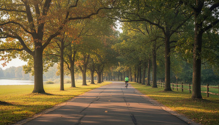 A family of four walks along a scenic autumn trail surrounded by vibrant trees