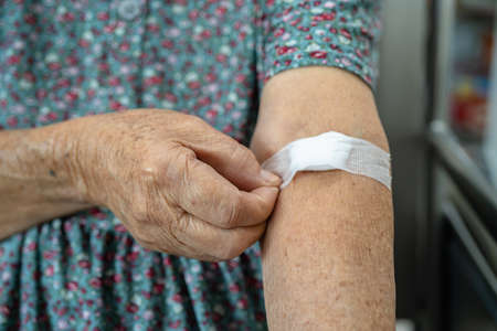 Asian senior or elderly old lady woman patient show cotton wool stop bleeding, after blood drawing testing for annually physical health check up to check cholesterol, blood pressure, and sugar level.