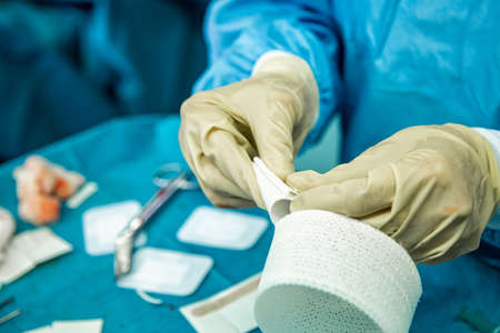 Plaster, blood gauze and roll gauze on green surgical dress for clean wound
