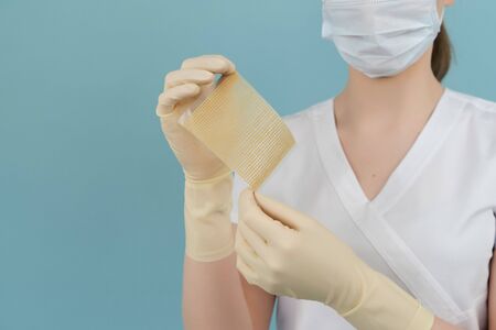 The traumatologist puts a bandage on the forearm of the female patient. The concept of help with fractures and sprains. The technique of applying a cruciform bandage.