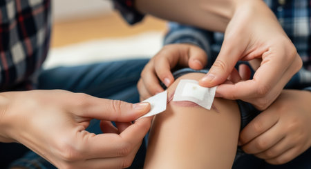 Adult gently applies a bandage to a child's knee, highlighting a caring moment in a cozy home setting, emphasizing the importance of health and emotional support