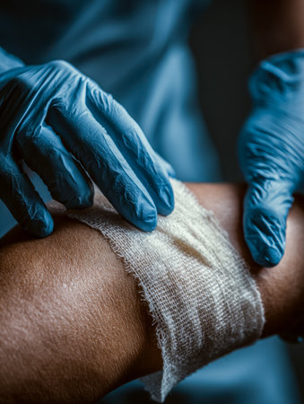 A healthcare professional carefully applies a sterile bandage to a patient's arm, creating a calm, focused atmosphere in clinical surroundings.