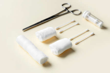 Medical bandage rolls, cotton buds and surgical tool on color background, closeup