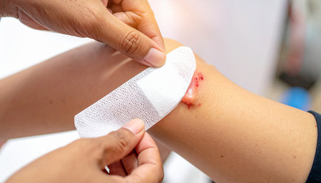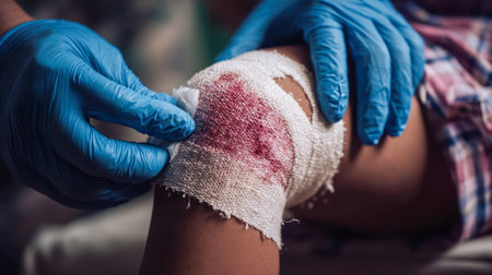 A person applies a white gauze bandage to a scraped knee with visible redness. Clear details and vibrant color...