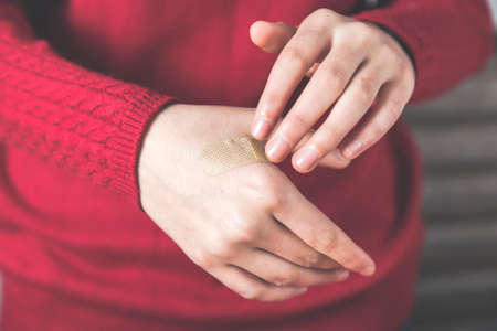 Closeup of human hand sticking plaster adhesive bandage to wound cut skin. Medical.