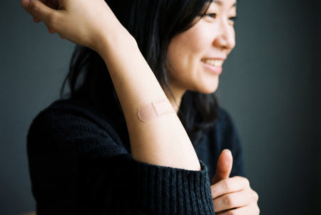 A cinematic close-up focuses on an Asian woman's left arm, clearly showing a flesh-toned bandage, with her hand visible in the lower part of the frame, as she smiles, indicating recovery