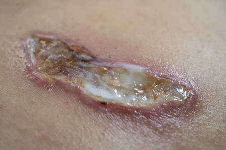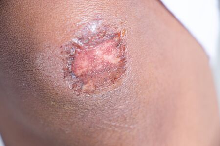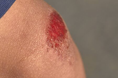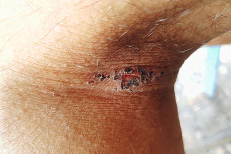 Scab wound infected on man arm closeup