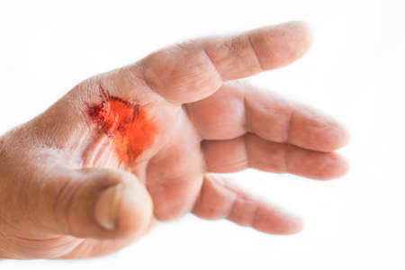 Red wound on the palm, arm, wrist after a burn or fall. First aid in wound treatment. Treatment of wounds