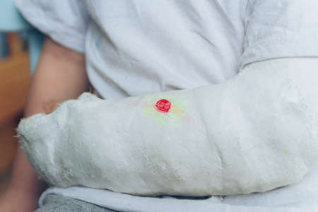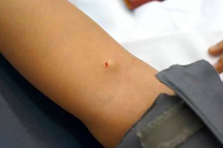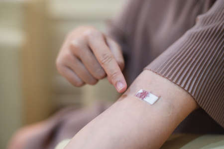 Morphology, vaccines concept. Closeup of bandage with red stains on arm after taking blood sample
