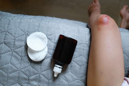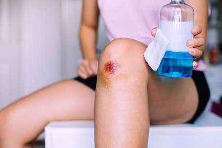 Woman using alcohol into a cotton for cleaning bleeding wound on knee,Scab becomes Infected