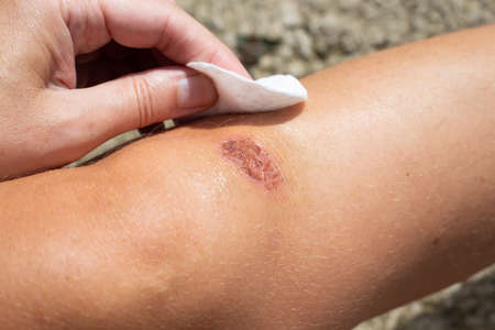 Close-up of bloody gash on knee. Wound treatment with antiseptic.