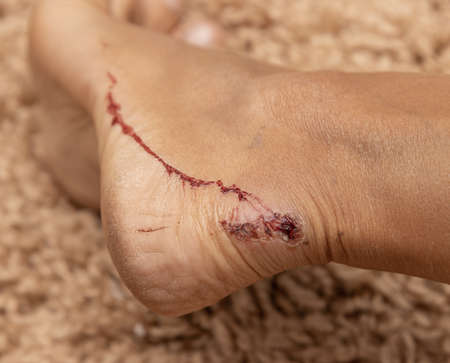 The wound stitched in the foot by doctors in the hospital. Accidental wounds .
