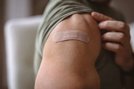 Mid section of caucasian man showing his vaccinated shoulder at home. vaccination for prevention of coronavirus outbreak concept