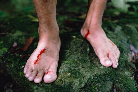 Wounds and blood on men foot caused by bloodsucker in Hala Bala wildlife sanctuary. Thailand.