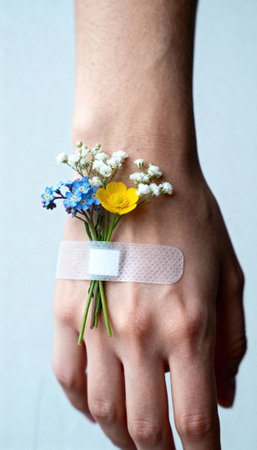Hand with small wildflowers taped to the skin by an adhesive bandage, conveying themes of care and gentle healing. Soft lighting and a neutral background highlight skin texture and delicate blooms for editorial use