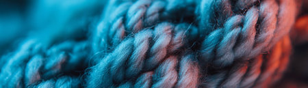 A detailed macro shot captures intertwined dark blue and black textured ropes. The foreground exhibits a precise weave, contrasted by a blurred background with blue light. AI-generated content