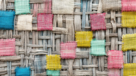 This close view shows a beautifully woven fabric made from natural fibers. The textured pattern highlights its craftsmanship, emphasizing the ropes and threads used in the design.