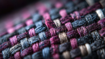 A close-up image showcasing the intricate weave of a fabric with alternating pink and black strands, highlighting the texture and color variations.