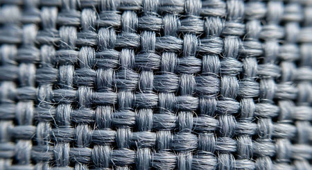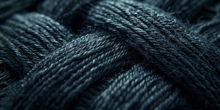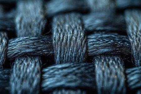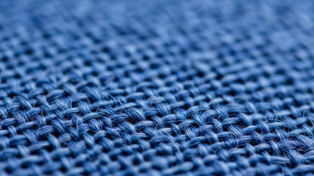An extreme close-up macro captures the intricate texture of a tightly woven blue fabric. The focuses on the individual threads and fibers, showing how they are interlaced to create a dense and robust weave. The color is a deep, rich blue, reminiscent of indigo or navy. The texture appears slightly coarse and rustic, highlighting the natural and its construction. This detailed view reveals the underlying pattern and structure of the textile, making it an background or detail shot for fashion,...