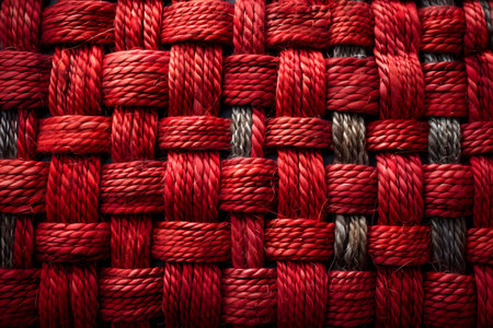 Close-up shot of a red and gray woven texture displaying intricate patterns, the fiber details and craftsmanship. ideal for textile design inspiration, background textures, and pattern studies. Generative AI