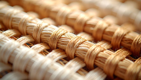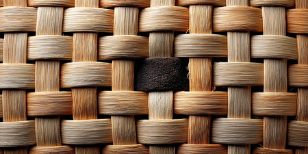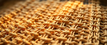 This image features a close-up view of woven natural fibers, highlighting the intricate texture and detail of the material, creating a warm and inviting atmosphere for design applications