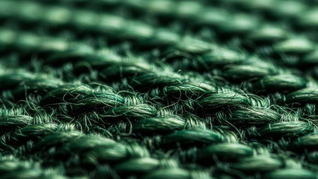 A detailed macro captures the intricate texture of a dark green woven fabric. The focuses on the individual threads and their interlacing pattern, revealing the depth and complexity of the weave. The rich green hue and the tactile of the are emphasized, making it use as a background or for showcasing properties in contexts.