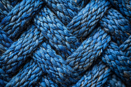 This close-up image showcases a twisted rope with rich blue hues, highlighting its textured fibers and intricate knot design, perfect for nautical themes.