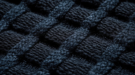 A close-up view of a textured dark blue knitted fabric showcasing an intricate weave pattern, ideal for highlighting warmth and elegance in design.